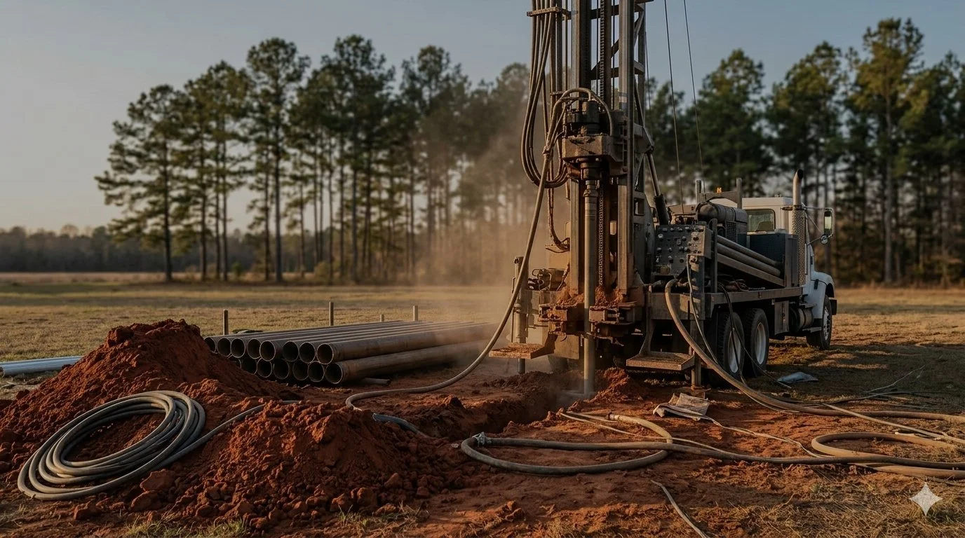 Residential water well installation for Burke County homes and rural properties. Wells in this part of middle Georgia typically reach the Floridan aquifer at depths of 80–200 feet through dense red clay upper soil layers. A Georgia EPD permit is required and is handled as part of every well drilling installation.